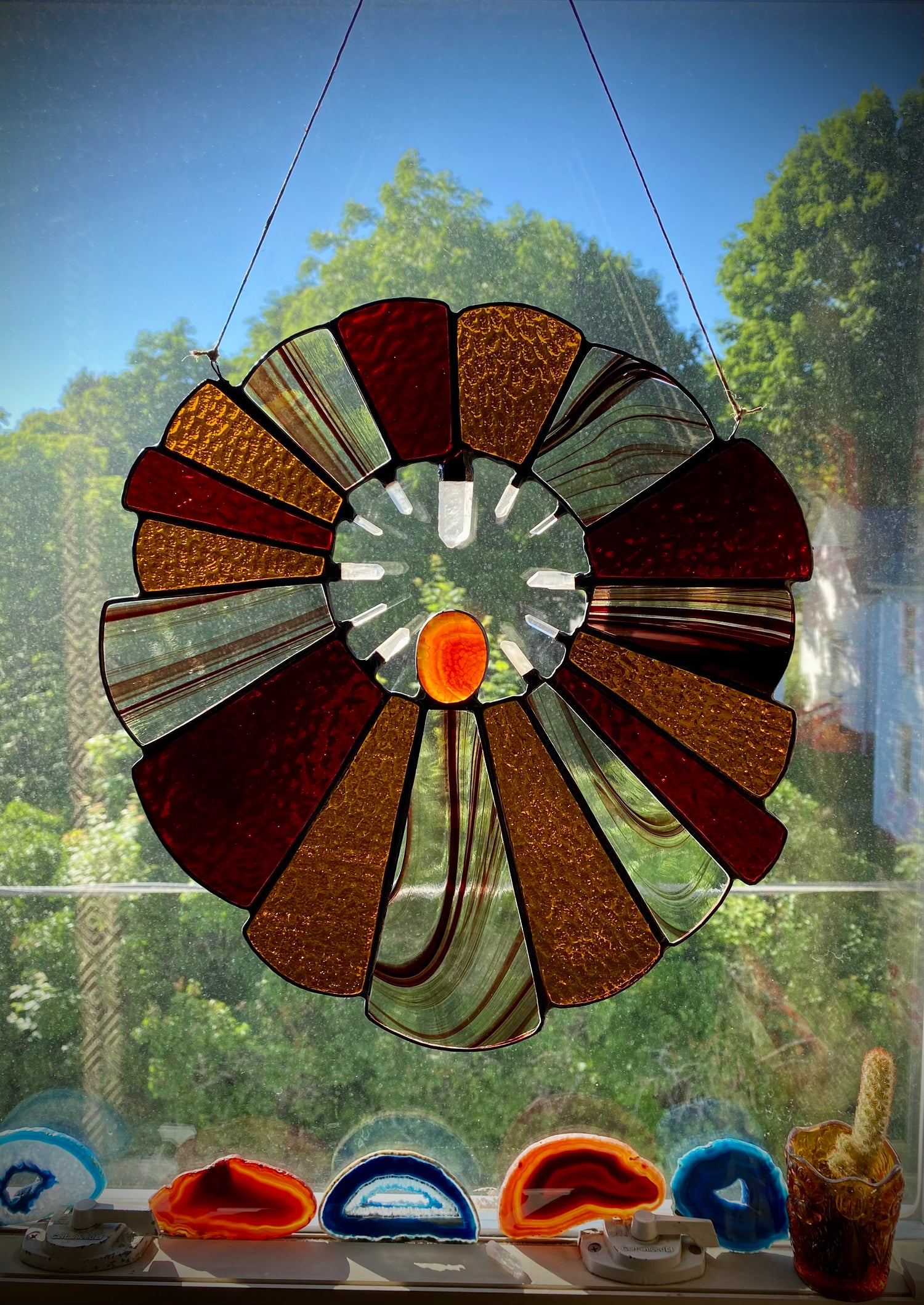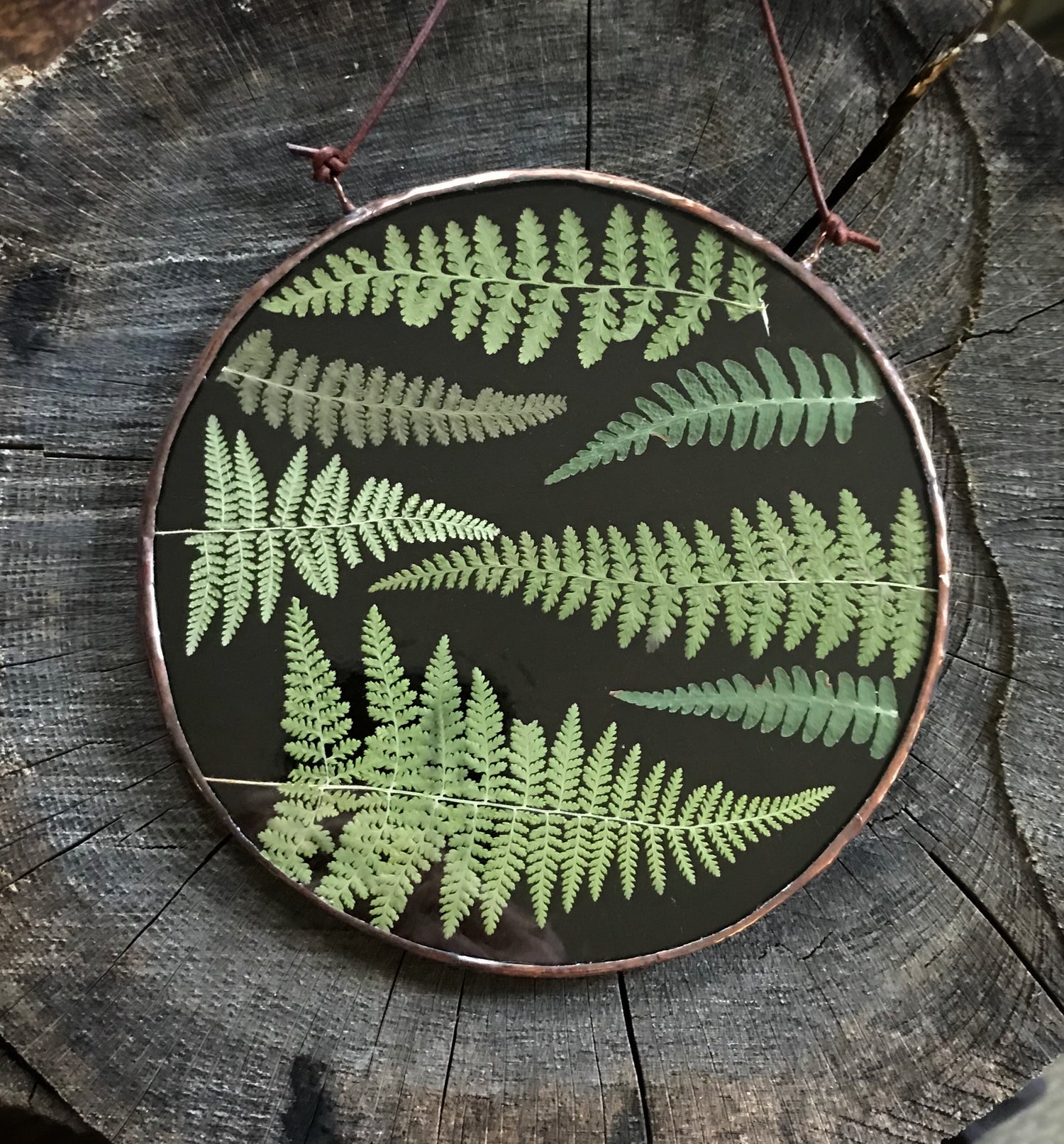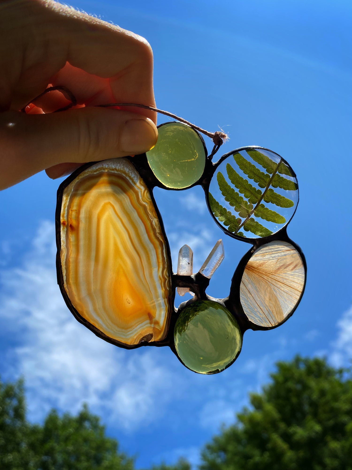 Glass, Agate Slice, Quartz Crystals, Fern, Lily Petals