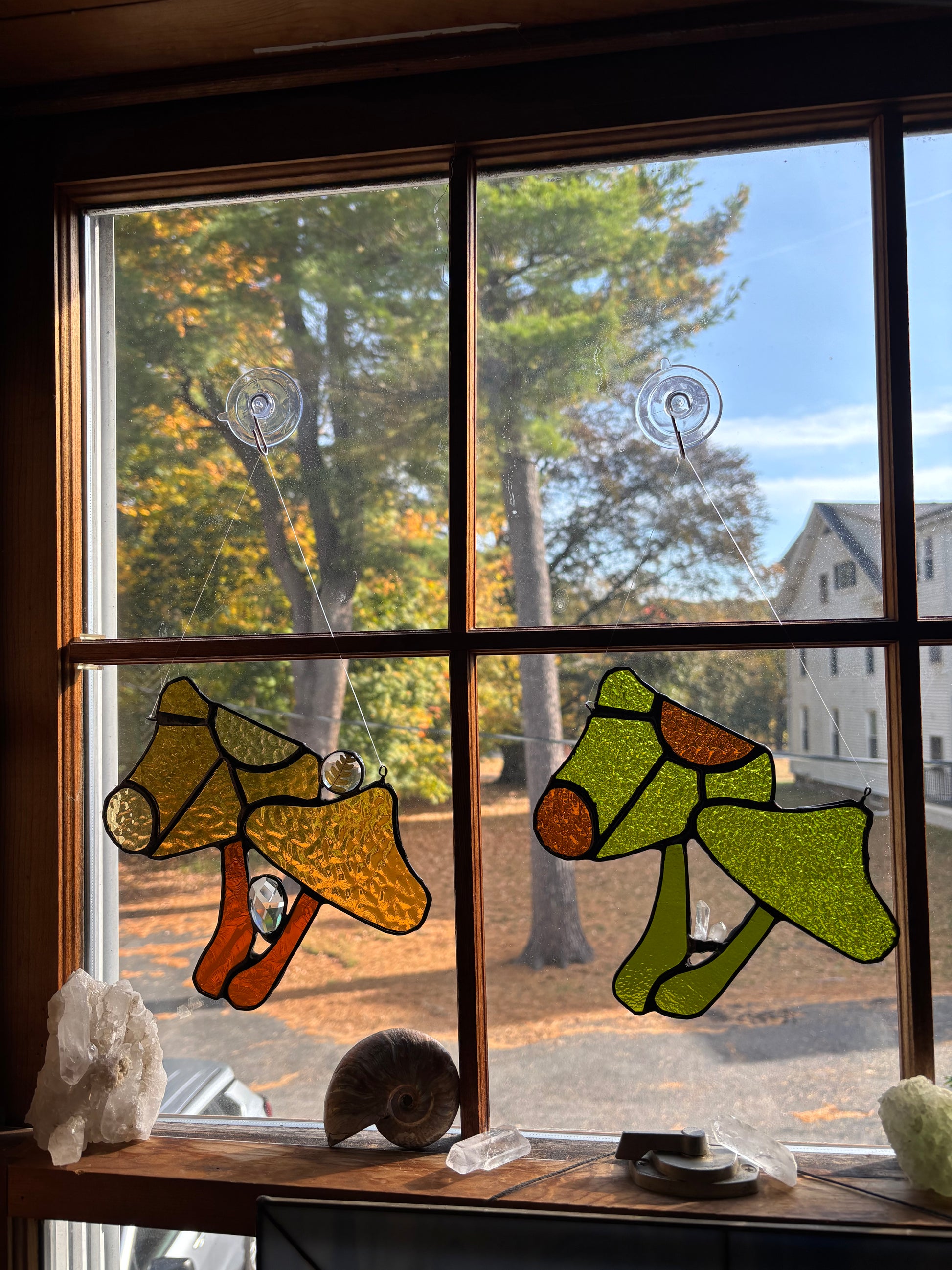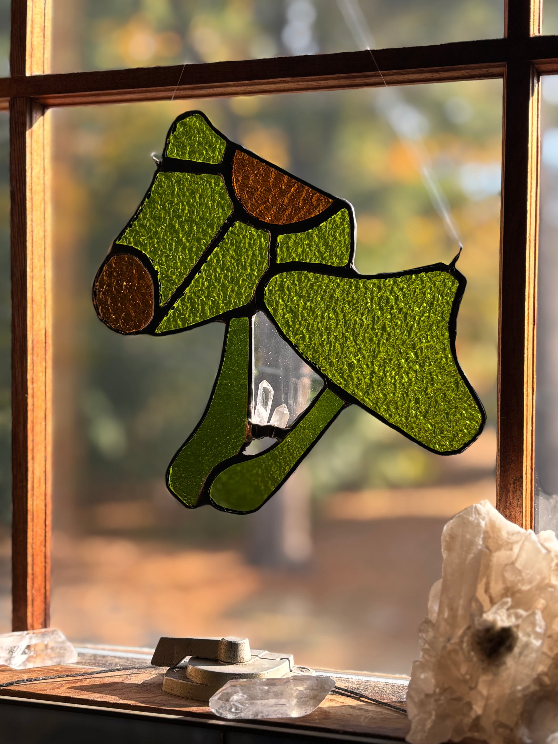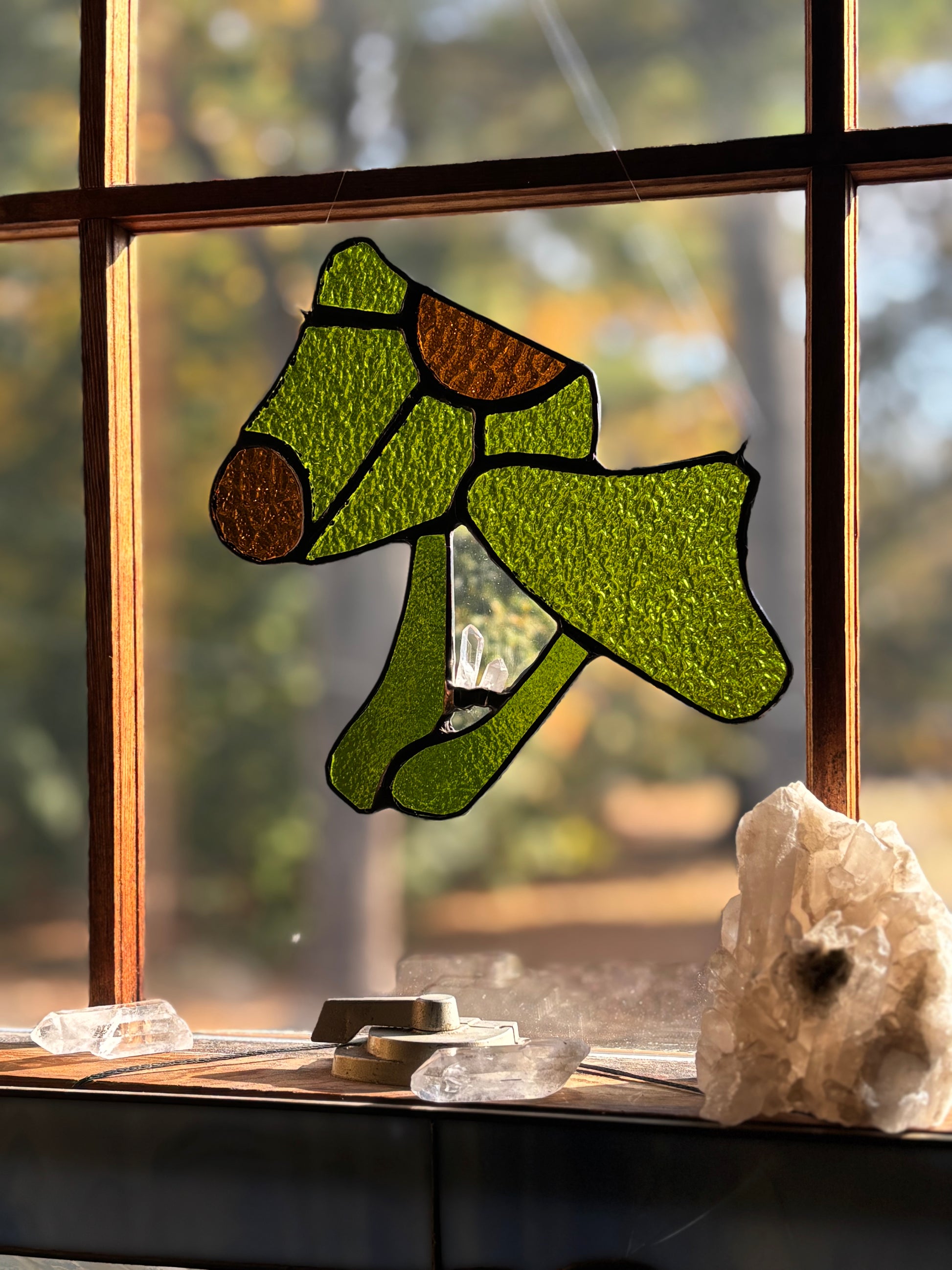 This mushroom suncatcher was handcrafted using a variety of high quality glass. Two quartz crystals are growing from the base of the mushroom.