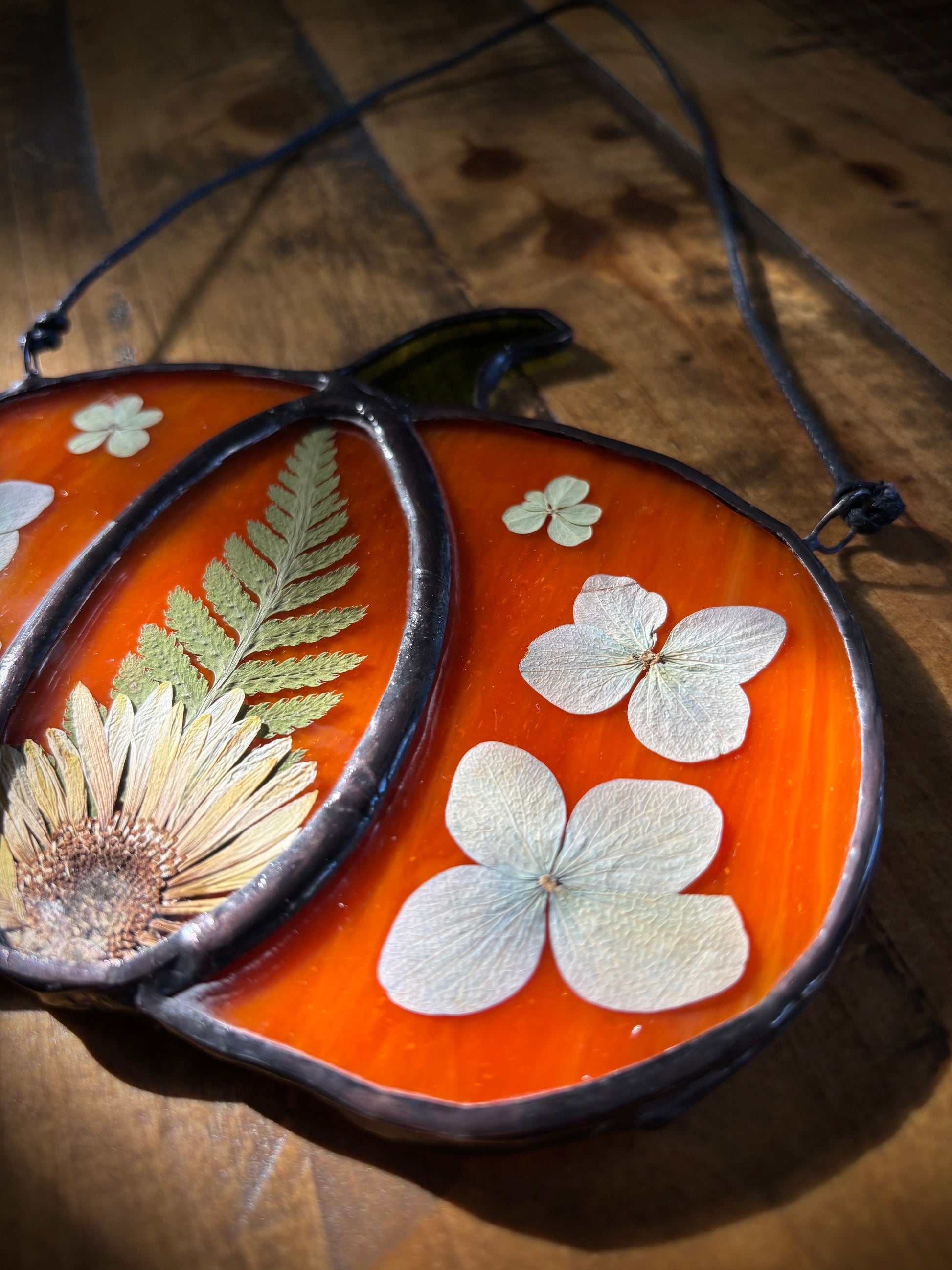 Stained Glass Pumpkin Suncatcher with Pressed Fern & Flowers